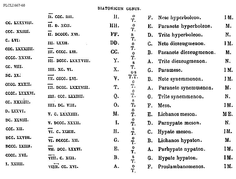 [PLCLI:667-68; text: DIATONICUM GENUS. CC. LXXXVIII. CCC. XXIIII. C. LVI. CCC. LXXXIIII. CCCC. XXXII. CC. VIII. DC. XL. CCCC. XXXII. CCCC. LXXXVI. CC. XXXIIII. D. LXXVI. DC. XLVIII. CCC. XII. DCC. LXVIII. DCCC. LXIIII. CCCC. XVI. I. XXIIII. II[macron supra lin.]. CCC. IIII. II[macron supra lin.]. D. XCII. II[macron supra lin.]. DCCCC. XVI. III. LXXII. III[macron supra lin.]. CCCC. LVI. III[macron supra lin.]. DCCC. LXXXVIII. IIII. XC. VI. III[macron supra lin.]. CCCC. LVI. III[macron supra lin.]. DCCC. LXXXVIII. IIII. CCC. LXXIIII. IIII. DC. VIII. V. C. LXXXIIII. V. DCCC. XXXII. VI[macron supra lin.]. C. XLIIII. VI[macron supra lin.]. DCCCC. XII. VII[macron supra lin.]. DCC. LXXVI. VIII[macron supra lin.]. C. XCII. VIIII[macron supra lin.]. CC. XVI. H. HH. FF. DD. CC. Y. X. V. T. Q. O. M. I. G. E. B. A. Tonus, Semitonium, F. E. D. C. B. A. G. Nete hyperboleon. Paranete hyperboleon. Trite hyperboleon. Nete diezeugmenon. Paranete diezeugmenon. Trite diezeugmenon. Paramese. Nete synemmenon. Paranete synemmenon. Trite synemmenon. Mese. Lichanos meson. Parnypate meson. Hypate meson. Lichanos hypaton. Parhypate nypaton. Hypate hypaton. Proslambanomenos. IM. M. N. ME.]