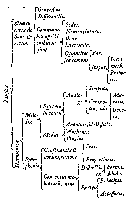 [Beurhusius, 16; text: Musica, Elementaria de sonis et eorum Generibus. Differentiis. Communibus affectionibus ut sunt Sedes. Nomenclatura. Ordo. Intervalla. Quantitas seu tempus Par. Impar Incrementum. Proportio. Harmonica, Melodia, Systema in cantu, Modus, Analogo, Anomalo, idest, ficto. Authenta. Plagius. Simplici. Coniuncto, ubi Mutatio. Genera. Symphonia Consonantia sonorum, ratione Soni. Proportionis. Concentus melodiarum, cuius Distinctio ex Forma. Modo. Partes Principes. Accessoriae]