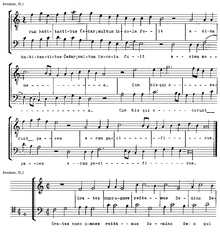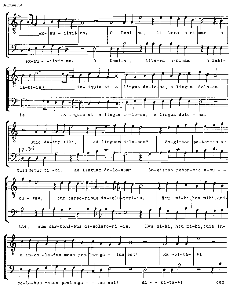 [34][Beurhaus, 34; text: /p.36/, exaudivit me. O Domine, libera animam a labiis iniquis et a lingua dolosa, Quid detur tibi, ad linguam dolosam? Sagittae potentis acutae, cum carbonibus desolatoriis. Heu mihi, quia incolatus meus prolongatus est! Habitavi cum]