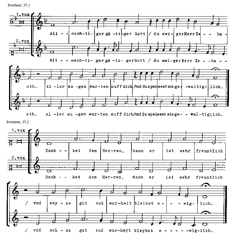 [Beurhaus, 37,1; text: prima, secunda, vox, Allmechtiger guetiger Gott / du ewiger Herr Zebaoth. Aller augen warten auff dich / vnd du speisest sie gewaltiglich.]