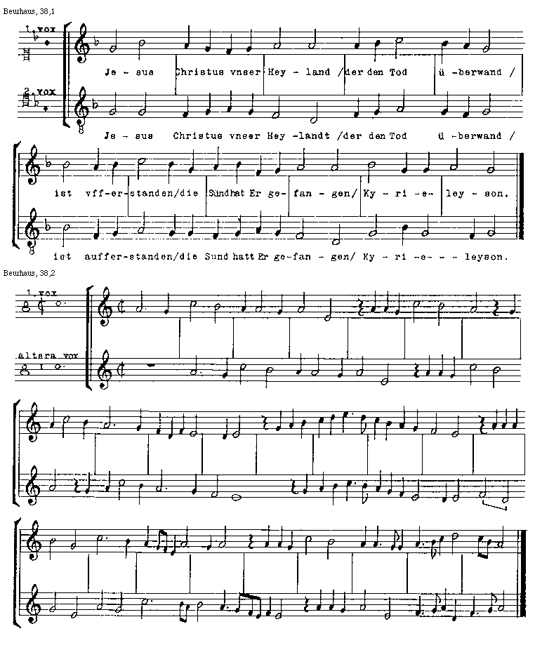 [Beurhaus, 38,1; text: prima, secunda, altera vox, Jesus Christus vnser Heyland / der den Tod ueberwand / ist vfferstanden / die Suend hat Er gefangen / Kyrieleyson, aufferstanden, hatt]