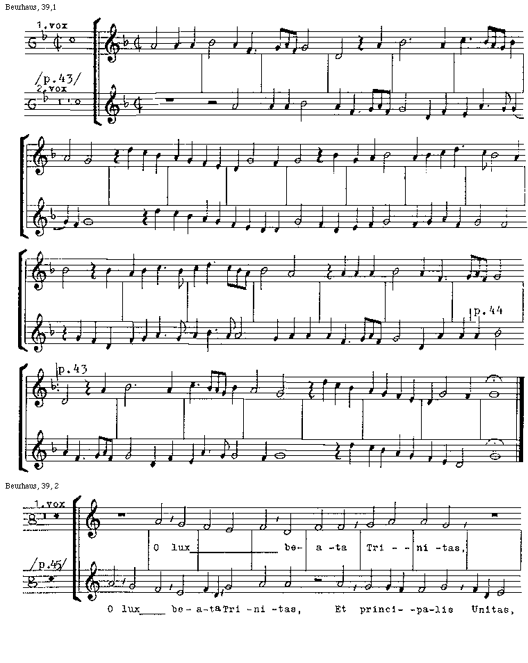 [Beurhaus, 39,2; text: prima, vox, /p.45/, O lux beata Trinitas, Et principalis Unitas]