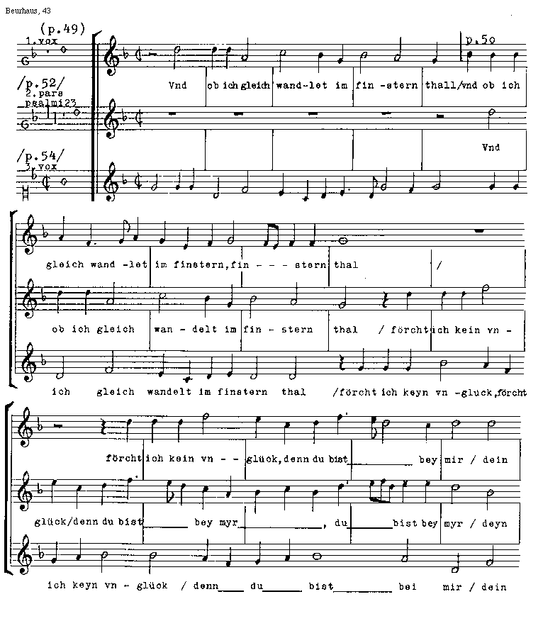 [Beurhaus, 43; text: (p.49), /p.52/, /p.54/, prima, secunda pars psalmi 23, tertia, vox, p.50, Vnd ob ich gleich wandlet im finstern thall /, wandelt, thal, foercht ich kein vnglueck, denn du bist bey mir /, dein, deyn, keyn, bei]