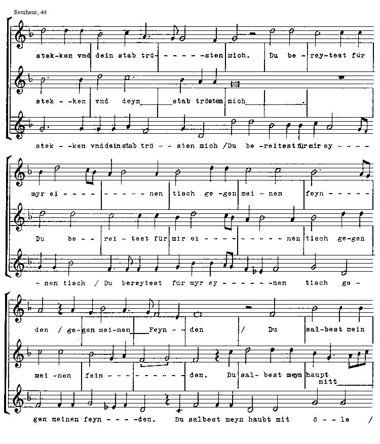 [44][Beurhaus, 44; text: stekken vnd dein stab troesten mich. Du bereytest fuer myr einen tisch gegen meinen feynden /, bereitest, mir, feinden / Du salbest mein haupt mitt oele, meyn]