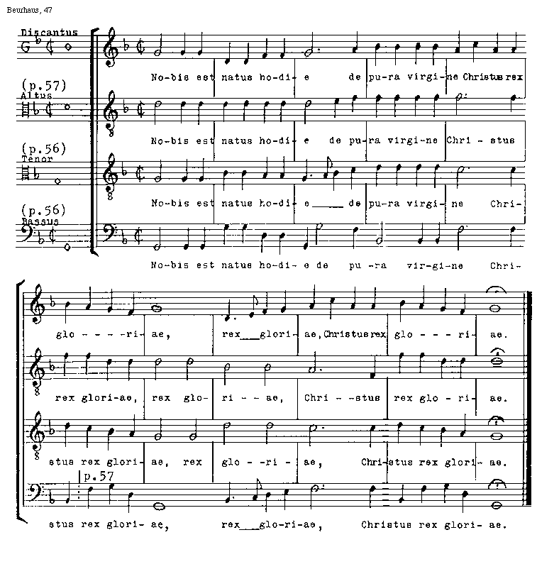 [Beurhaus, 47; text: Discantus, Altus, Tenor, Bassus, p.56, p.57, Nobis est natus hodie de pura virgine Christus rex gloriae]