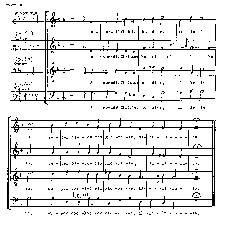[Beurhaus, 50; text: Discantus, Altus, Tenor, Bassus, (p.60), (p.61), Ascendit Christus hodie, alleluia, super caelos rex gloriae]