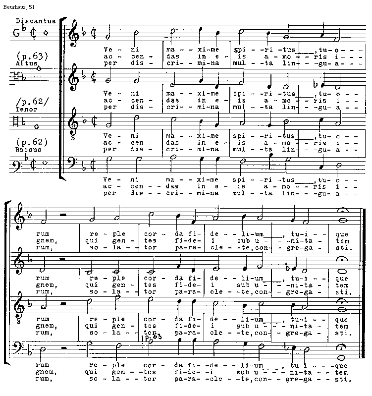 [51][Beurhaus, 51; text: /p.62/, p.63, Discantus, Altus, Tenor, Bassus, Veni maxime spiritus, tuorum reple corda fidelium, tuique accendas in eis amoris ignem, qui gentes fidei sub unitatem
