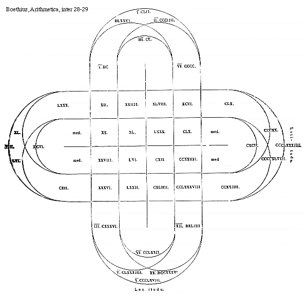 [24]numero pariter inpari sola divisionem recipit maior extremitas, in illo vero solus minor terminus sectione solutus est, et quod in forma pariter paris numeri ab extremitatibus incipienti et usque ad media progredienti, quod continetur sub extremis terminis, idem est illi, quod continetur sub intra se positis summulis atque hoc idem usquedum ad duas medietates fuerit ventum in dispositionibus scilicet paribus; si autem fuerint inpares dispositiones, quod ab una medietate conficitur, hoc idem sub altrinsecus positis partibus procreatur, atque hoc usquedum ad extremitates progressio fiat. In ea enim dispositione, quae est par ut II. IIII. VIII. XVI,, idem reddunt .II. per .XVI. multiplicati, quod .IIII. per octonarium ducti, utroque enim modo .XXXII. fient. Quod si inpar sit ordo, ut est II. IIII. VIII., idem facient extremi, quod medietas; bis enim .VIII. sunt .XVI., qui numerus a quaternario in se ducto perficitur. In numero vero pariter inpari, si fuerit unus in medio terminus, circum se positorum terminorum, si in unum redigantur, medietas est, et idem eorum quoque, qui super hos sunt terminos, medietas est, atque hoc usque ad extremos omnium terminorum, ut in eo ordine, qui est pariter inparium numerorum, II. VI. X., iunctus binarius cum denario .XII. explet, cuius senarius medietas invenitur. Si vero fuerint duae medietates iunctae, ipsae utraeque aequales erunt super se terminis constitutis, ut est in hoc ordine II. VI. X. XIIII. Iuncti enim .II. et .XIIII. in .XVI. crescunt, quos senarius cum denario copulatus efficiet. Atque