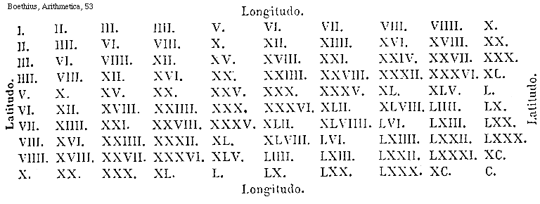 [Boethius, Arithmetica, 53; text: Longitudo. Latitudo. I. II. III. IIII. V. VI. VII. VIII. VIIII. X. XII. XIIII. XVI. XVIII. XX. XV. XXI. XXIV. XXVII. XXX. XXIIII. XXVIII. XXXII. XXXVI. XL. XXV. XXXV. XLV. L. XLII. XLVIII. LIIII. LX. XLVIIII. LVI. LXIII. LXX. LXIIII. LXXII. LXXX. LXXXI. XC. C.]