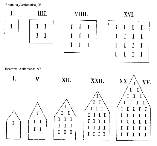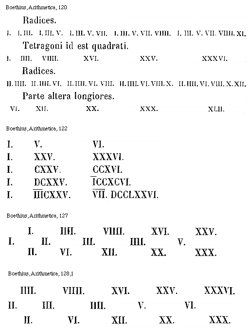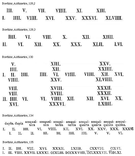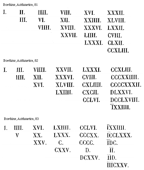[83][Boethius, Arithmetica, 83; text: I. IIII. XVI. LXIIII. CCLVI. I[macron supra lin.]XXIIII. V XX. LXXX. CCCXX. I[macron supra lin.]CCLXXX. XXV. C. CCCC. I[macron supra lin.]DC. CXXV. D. II[macron supra lin.]. DCXXV. II[macron supra lin.]D. III[macron supra lin.]CXXV.]