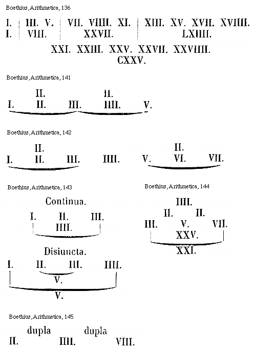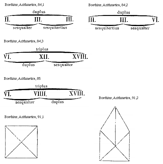 [Boethius, Arithmetica, 84,1; text: II. III. duplus, sesqualter, sesquitertius]
