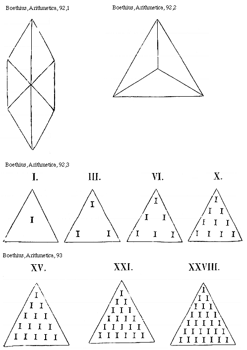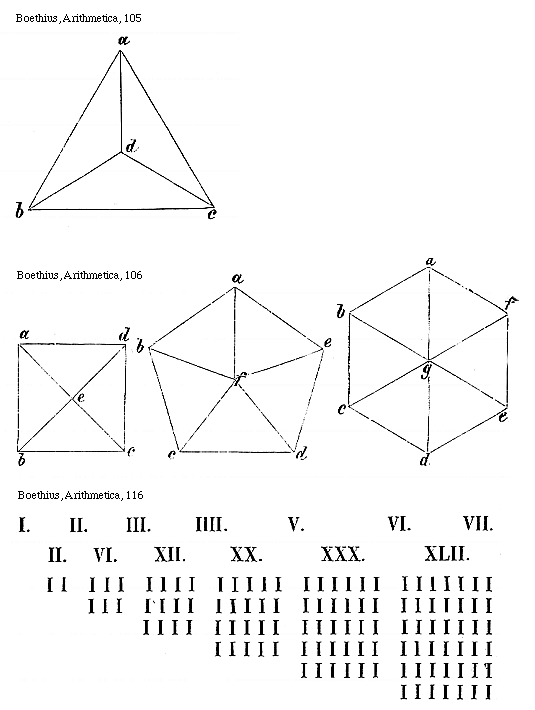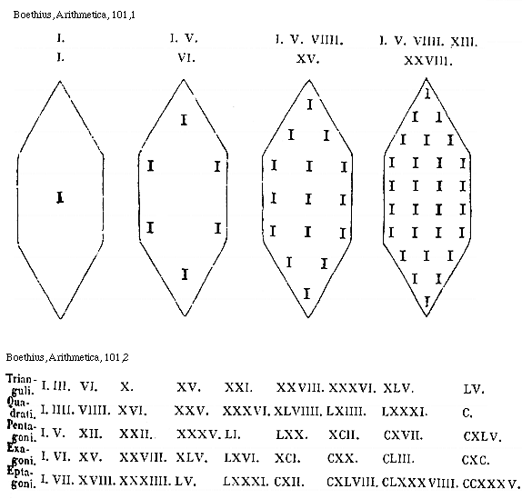 IIII. Haec quidem de quantitate, quam secundum ad [?] aliquid speculamur, ad praesens dicta sufficiant. Nunc autem in hac sequentia quaedam de ea quantitate, quae per se ipsam constat, neque ad aliquid refertur, expediam, quae nobis ad ea prodesse possint, quae post haec rursus de relata ad aliquid quantitate tractabimus. Amat enim quodammodo matheseos speculatio alterna probationum ratione constitui. Nunc autem nobis de his numeris sermo futurus est, qui circa figuras geometricas et earum spatia demensionesque versantur, id est de linearibus numeris et de triangularibus vel quadratis ceterisque, quos sola pandit plana demensio, nec non de inaequali laterum compositione coniunctis; de solidis etiam, id est cybis et sphericis vel pyramidis, laterculis etiam vel tignulis et cuneis, quae omnia quidem geometricae propriae considerationis sunt, sed sicut ipsa geometriae scientia ab arithmetica velut quadam radice ac matre producta est, ita etiam eius figurarum semina in primis numeris invenimus, planum siquidem fecimus, quod omnes disciplinas haec interempta consumeret, quas minime constituta firmaret. Hoc autem cognoscendum est, quod haec signa numerorum, quae posita sunt, quae nunc quoque homines in summarum designatione describunt, non naturali institutione formata sunt. Ut enim quinarii subiectam notulam