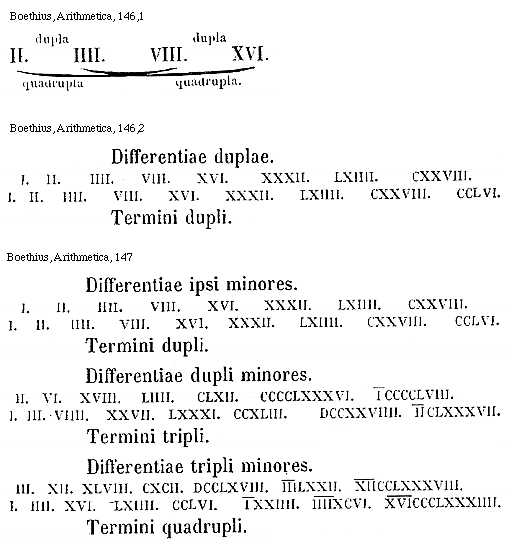 [146][Boethius, Arithmetica, 146,1; text: dupla, quadrupla, II. IIII. VIII. XVI.]