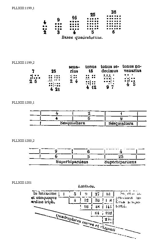 [PLLXIII:1201; text: Latitudo. In latitudine et unoquoque ordine tripli. 1, 3, 9, 27, 81, 4, 12, 36, 108, 16, 48, 144, 64, 192, 236, Superas ad proximos inferos sesquitertii. Quadruplares omnes et diagonii]