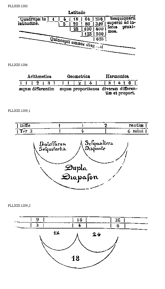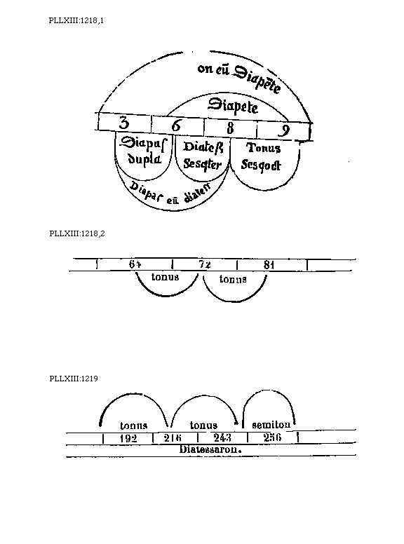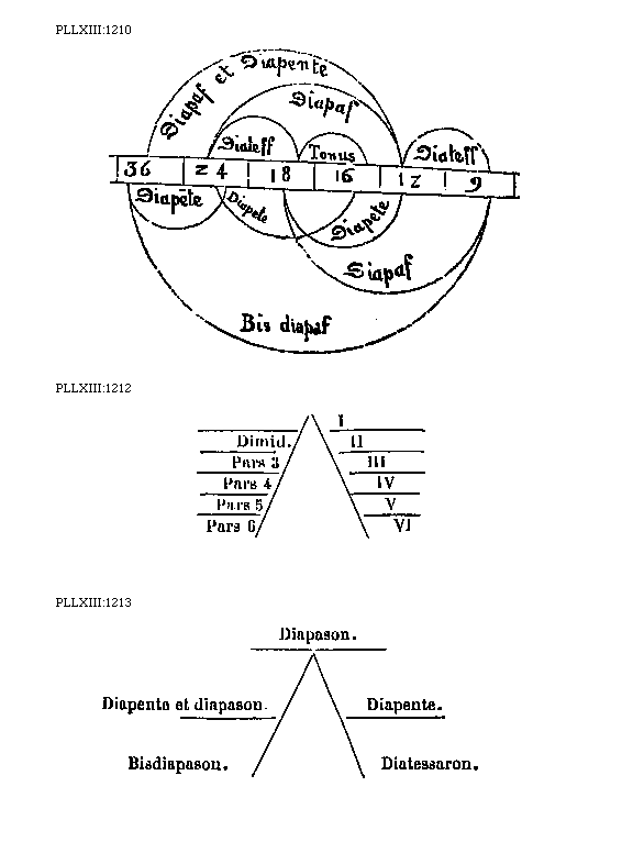 [1210][PLLXIII:1210; text: Diapafon et Diapente, Diapason, Diateffaron, Tonus, Diatessaron, 36, 24, 18, 16, 12, 9, Diapente, Bis diapafon]