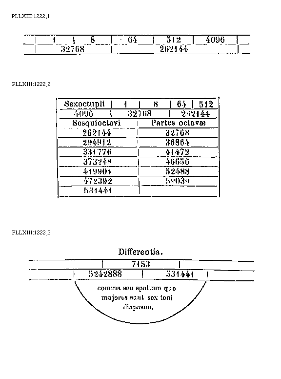 [PLLXIII:1222,3; text: Differentia. 7153, 5242888, 531441, comma seu spatium quo majores sunt sex toni diapason.]