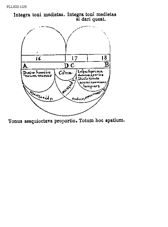 [PLLXIII:1225; text: Integra toni medietas. Integra toni medietas si dari queat. 16, 17, 18, A, D, C, B, Diesis homiionium minus, Comma, Sesquiseprima decima pportio Diesis hemitoniuminus minor toni pars, Apotome 16 pportirotio, Acotomo mair touv pars, Tonus sesquioctava proportio. Totum hoc spatium.]