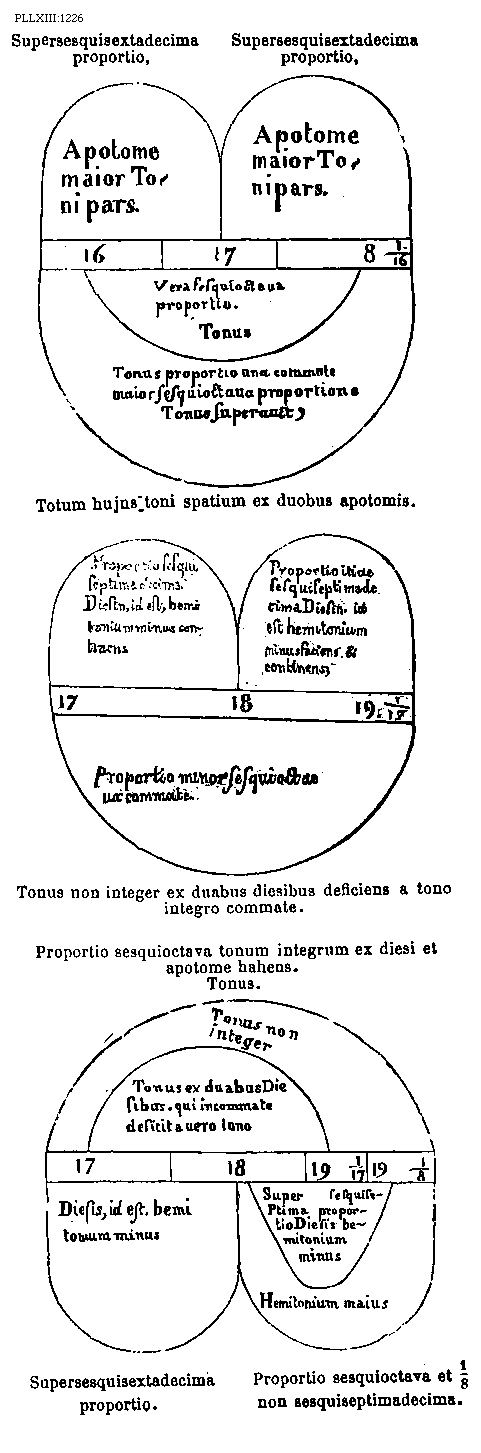 [1226][PLLXIII:1226; text: Supersesquisextadecima proportio, Apotome maior Toni pars. 16, 17, 8 1/16, Vera sesquioctava proportio. Tonus, Tonus proportio una commate maior sesquioctaua proportione Tonus superauctus, Totum hujns toni spatium ex duobus apotomis. Proportio sesquiseptimadecima. Diesin, id est, hemitonium minus continens, Proportio itide sesquiseptimadecima Diesin, id est hemitonium minus faciens et continens; 17, 18, 19 1/17, Proportio minor sesquioctaeua commate. Tonus non integer ex duabus diesibus deficiens a tono integro commate. Proportio sesquioctava tonum integrum ex diesi et apotome hahens. Tonus non integer, Tonus ex duabus Diesibus. qui incommate deficit a uero tono, 17, 18, 19 1/17, 19 1/8, Diesis, id est. bemitonium minus, Super sesquisePtima proportio Diesis bemitonium minus, Hemitonium maius, Supersesquisextadecima proportio. Proportio sesquioctava et 1/8 non sesquiseptimadecima.]