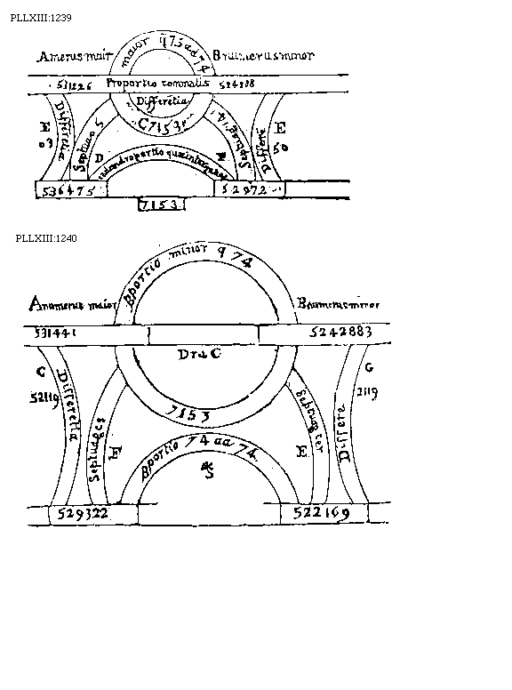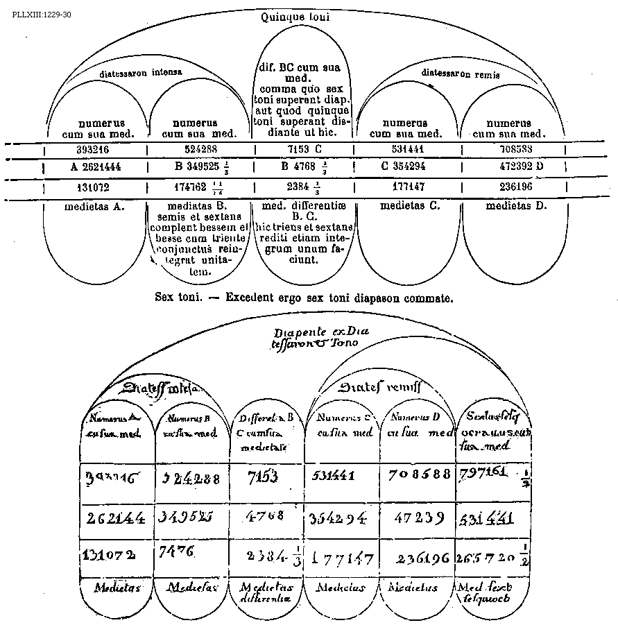 [PLLXIII:1229-30; text: Quinque toni, diatessaron intensa, numerus cum sua medietate, 393216, A, 2621444, 131072, medietas A. 524288, B 349525 1/3, 174762 11/26, mediatas B, semis et sextans complent bessem et besse cum triente conjunctus reintegrat unitatem. differentia BC cum sua medietate, comma quo sex toni superant diapason aut quod quinque toni superant disdiante ut hic. 7153, C, 4768 2/3, 2384 1/3, medietas differentiae B. C. hic triens et sextans rediti etiam integrum unum faciunt. diatessaron remissa, 531441, 354294, 177147, medietas C. 708588, 472392 D, 236196, medietas D. Sex toni.--Excedent ergo sex toni diapason commate. Diapente ex Diatessaron et Tono, Numerus A cum sua medietate, Medietas, Numerus B cum sua medietate, 324288, 349525, 7476, 2384 1/3, Medietas differentiae, Numerus C cum sua medietate, Numerus D cum sua medietate, 47239, Sextussesquiocrauus cum sua medietate, 797161 1/2, 265720 1/2, Medietas sextus sesquioctauus]
