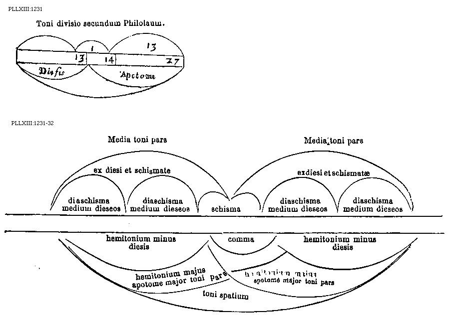 Philolaus igitur haec atque his minora spatia talibus diffinitionibus includit. Diesis, inquit, est spatium quo major est sesquitertia proportio duobus tonis. Comma vero est spatium quo major est sesquioctava proportio duabus diesibus, id est duobus semitoniis minoribus. Schisma est dimidium commatis. Diaschisma vero dimidium dieseos, id est semitonii minoris. Ex quibus illud colligitur, quoniam tonus quidem dividitur principaliter in semitonium minus atque apotomen. Dividitur etiam in duo semitonia et comma, quo fit ut dividatur in quatuor diaschismata et comma. Integrum vero dimidium toni quod est semitonium, constat ex duobus diaschismatibus, quod est unum semitonium minus, et schismate, quod est dimidium commatis. Quoniam cum totus tonus ex duobus semitoniis minoribus et commate conjunctus est, si quis id integre dividere velit, faciet unum semitonium minus commatisque dimidium. Sed unum semitonium minus dividitur iu duo diachismata. Dimidium vero commatis unum schisma est. Recte igitur dictum est integre dimidium tonum in duo diaschismata atque unum schisma posse partiri. Quo fit ut integrum semitonium a minore semitonio uno schismate differre videatur, apotome autem a minore semitonio duobus schismatibus differt, differt enim commate; sed duo schismata unum perficiunt comma.