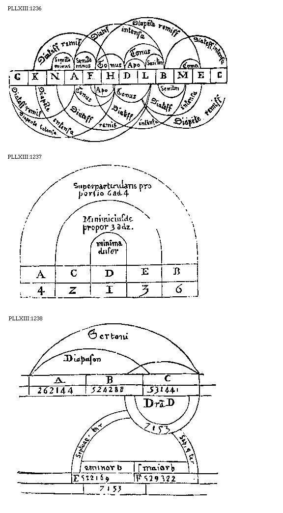 [PLLXIII:1234,4; text: Tres toni intensi, Apotome acuta, A, C, B, Diatessaron remissa.]