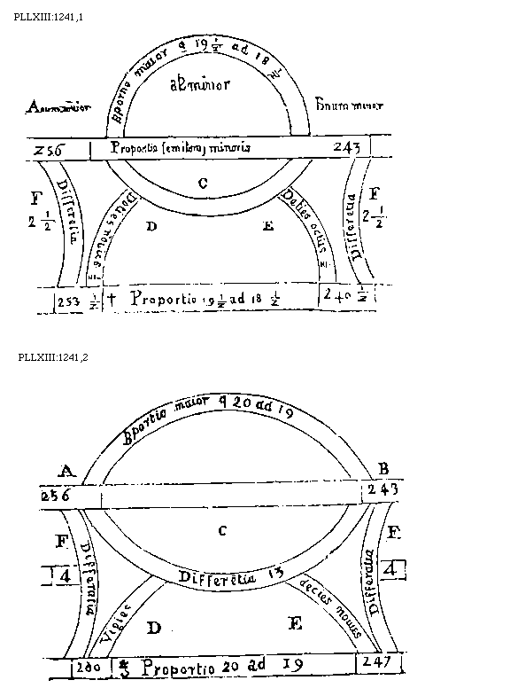 [PLLXIII:1241,2; text: A, Proportio major quam 20 ad 19, B, 256, 243, F, 4, Differentia, Differentia 13, C, Vigies, decies novies, 260, proportio 20 ad 19, 247]