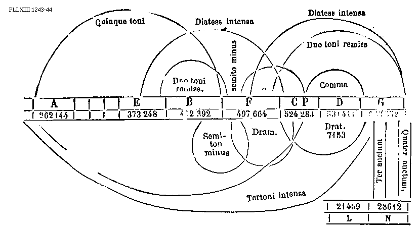 [1243][PLLXIII:1243-44; text: Quinque toni, Diatessaron intensa, Duo toni remissae, semitonium minus, A, 262144, E, 373248, B, 472392, F, 497664, C, P, 524283, D, 531441, G, 663352, Differentia M, Differentia t, 7153, Tertoni intensa, Ter auctum, Quater auctum, 21459, L, 28612, N]