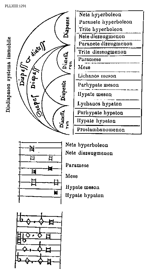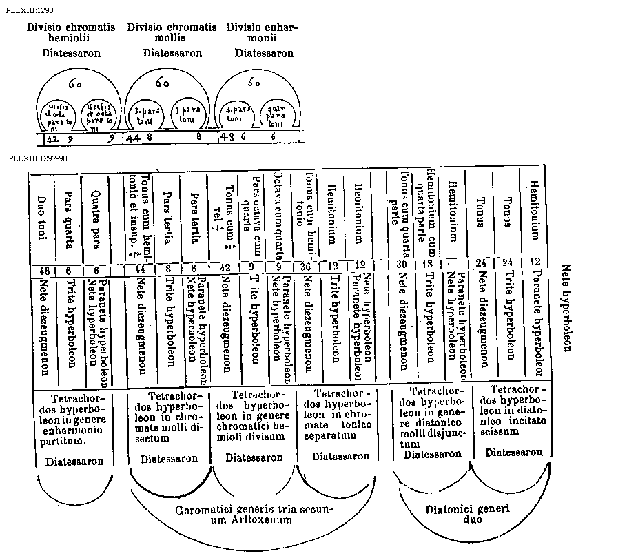 [PLLXIII:1297-98; text: Hemitonium, 12, Paranete hyperboleon, Tonus, 24, Trite hyperboleon, Nete diezeugmenon, Paranete hyperboleon, Nete hyperboleon, Hemitonium cum quarta parte, 18, Trite hyperboleon, Tonus cum quarta parte, 30, Nete diezeugmenon, Tonus cum hemitonio, 36, Octava cum quarta, 9, Pars octava cum quarta, Tonus cum 6/8 vel 3/4, 42, Pars tertia, 8, Tonus cum hemitonio et insuper 3/4, 44, Quatra pars, 6, Pars quarta, Duo toni, 48, Tetrachordos hyperboleon in genere enharmonio partitum. Tetrachordos hyperboleon in chromate molli disectum, Tetrachordos hyperboleon in genere chromatici hemioli divisum, Tetrachordos hyperboleon in chromate tonico separatum, Tetrachordos hyperboleon in genere diatonico molli disjunctum, Tetrachordos hyperboleon in diatonico incitato scissum, Chromatici generis tria secundum Aritoxenum, Diatonici generi duo]