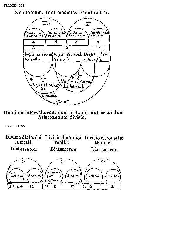 [PLLXIII:1295; text: Semitonium, Toni medietas Semitonium. Z, Diesis enharmonios, 4, 3, Diesis chromatis mollis, 4 1/8, Diesis chromatis hemioli, Tonus, Omnium intervallorum quae in tono sunt secundum Aristoxenum divisio.]