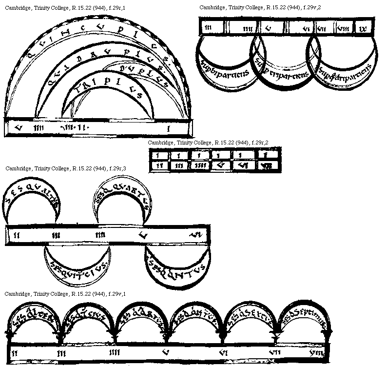 [Cambridge, Trinity College, R.15.22 (944), f.29v,1; text: sesqualter. sesquitertius. sesquiquartus. sesquiquintus. sesquisextus. sesquiseptimus. II, III, IIII, V, VI, VII, VIII]