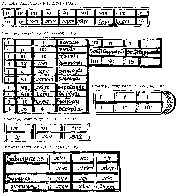 [Cambridge, Trinity College, R.15.22 (944), f.31r,1; text: I, II, IIII, dupla proportio]