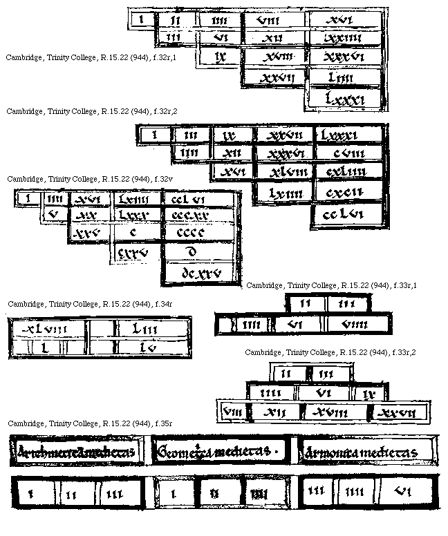 [Cambridge, Trinity College, R.15.22 (944), f.35r; text: Arithmetica medietas, Geometrica medietas, Armonica medietas, I, II, III, IIII, VI]