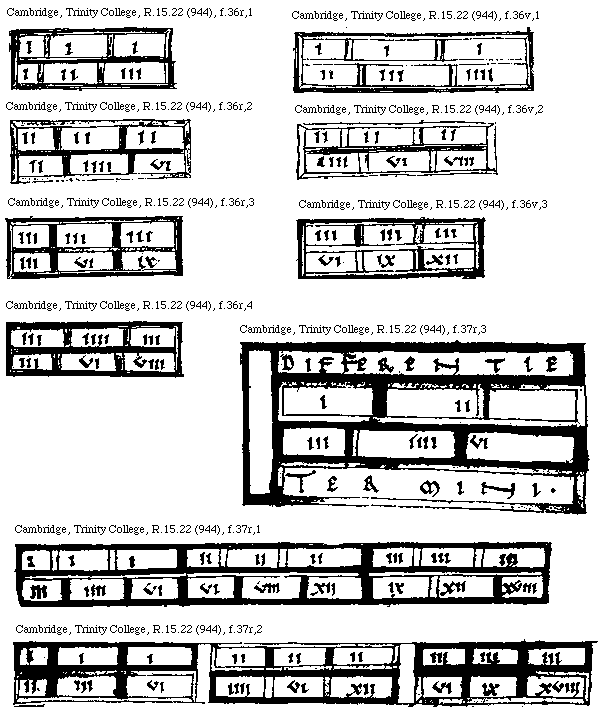 [Cambridge, Trinity College, R.15.22 (944), f.46v; text: Differentia, III[macron supra lin.]. CCCXXVIII, III[macron supra lin.]. CLVIIII, LXV[macron supra lin.]. XXXVI, LXII[macron supra lin.]. CCVIII, LVIIII[macron supra lin.]. XLVIIII, VI[macron supra lin.]. CCCC LXXX VII]