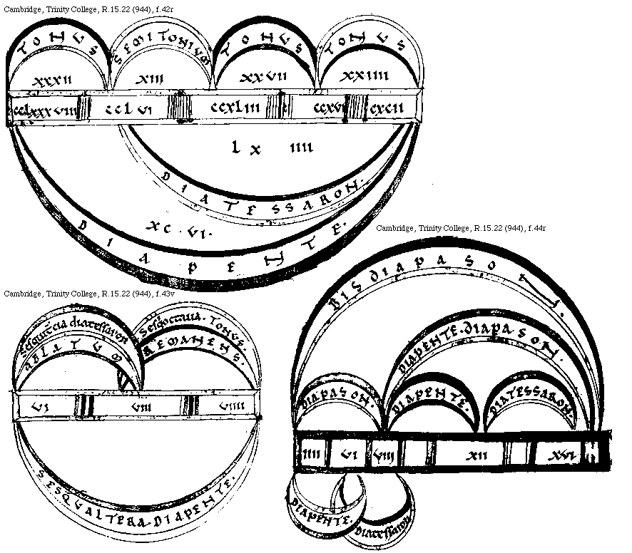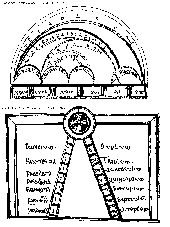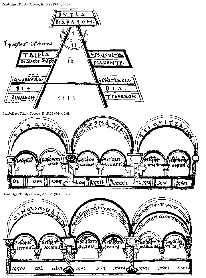 [Cambridge, Trinity College, R.15.22 (944), f.40v; text: Epogdous supradictorum, Dupla, Diapason, Tripla, diapason. diapente, Quadrupla, Bis diapason, Sesqualter, Diapente, Sesquitertia, Diatessaron, I, II, III, IIII]