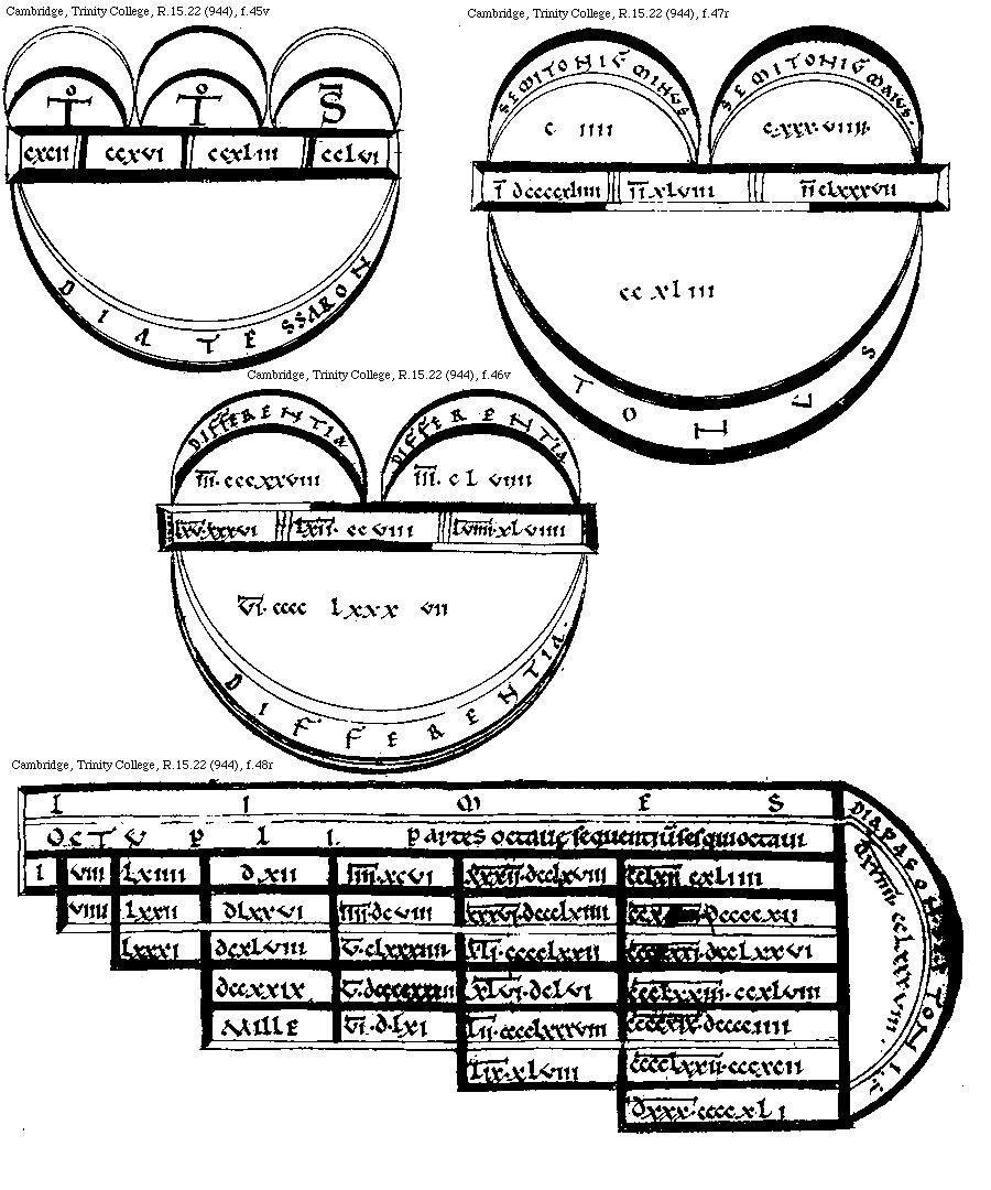 [Cambridge, Trinity College, R.15.22 (944), f.48r; text: I, VIII, LXIIII, DXII, IIII[macron supra lin.].XCVI, XXXII[macron supra lin.].DCCLXVIII, CCLXII[macron supra lin.].CXLIIII, CCXCIII[macron supra lin.].DCCCCXII, XXXVI[macron supra lin.].DCCCLXIIII, IIII[macron supra lin.].DCVIII, DLXXVI, LXXII, VIIII, CCCXXXI[macron supra lin.].DCCLXXVI, XLI[macron supra lin.].CCCCLXXII, V[macron supra lin.].CLXXXIIII, DCXLVIII, LXXXI, CCCLXXIII[macron supra lin.].CCXLVIII, XLVI[macron supra lin.].DCLVI, V[macron supra lin.].DCCCCXXXII, DCCXXIX, CCCCXIX[macron supra lin.].DCCCCIIII, LII[macron supra lin.].CCCCLXXXVIII, VI[macron supra lin.].D.LXI, MILLE, CCCCLXXII[macron supra lin.].CCCXCII, LIX[macron supra lin.].XLVIII, DXXX[macron supra lin.].CCCCXLI, LIMES, OCTVPLI partes octauae sequentium sesquioctaui, Diapason sex toni, DXVIIII[macron supra lin.]CCLXXXVIII.]