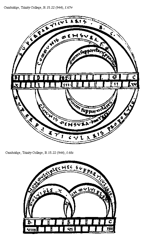 [Cambridge, Trinity College, R.15.22 (944), f.67v; text: Superparticularis .B.C. Communis mensura .E.G. Minimi superparticularis proportion. B, D, DF. G, C, X. I, III. II. XV, Minimi superparticulares. Communis mensura .duo.tres. Superparticularis proportio.]