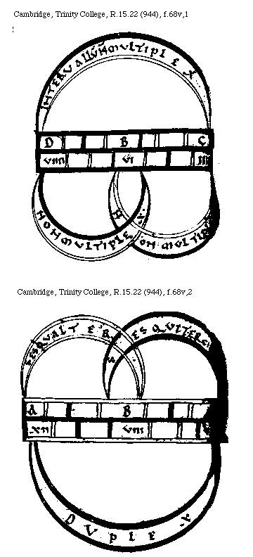[Cambridge, Trinity College, R.15.22 (944), f.68r; text: Non multiplex nec superparticularis. Multiplex. Non multiplex. D. B, C, VIIII, VI, IIII]