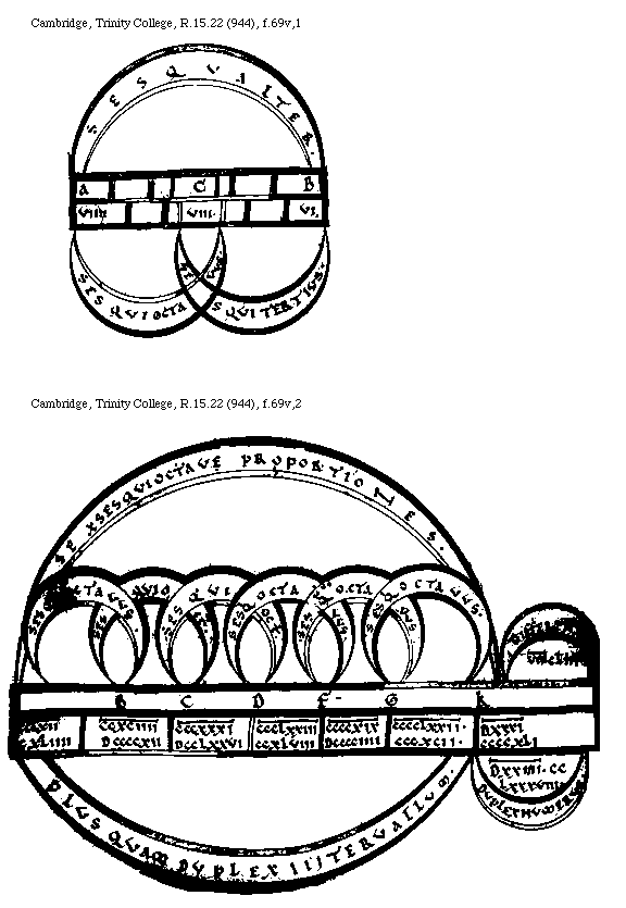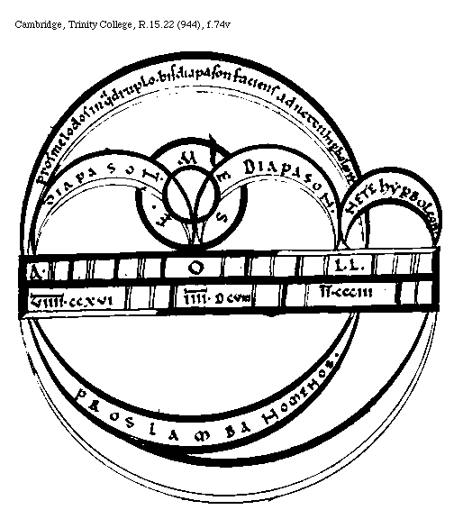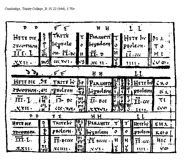 [Cambridge, Trinity College, R.15.22 (944), f.75v; text: DD, Nete diezeumenon, III[macron supra lin.].LXXII, Semitonium minus, EE, Trite hyperboleon, II[macron supra lin.].DCCCCXVI, Tonus, NN, Paranete hyperboleon, II[macron supra lin.].DXCII, LL, Nete hyperboleon, II[macron supra lin.].CCCIIII, Diatonium, II[macron supra lin.].DCCXXXVI, Cromaticum, Diesis differentia, II[macron supra lin.].DCCCCXCIIII, Enarmonicum]