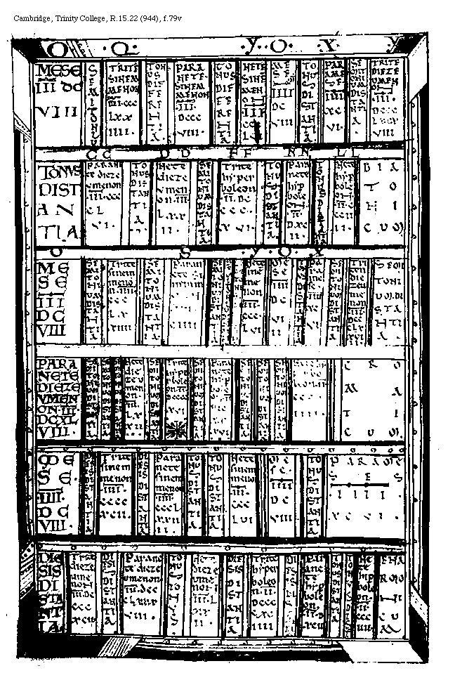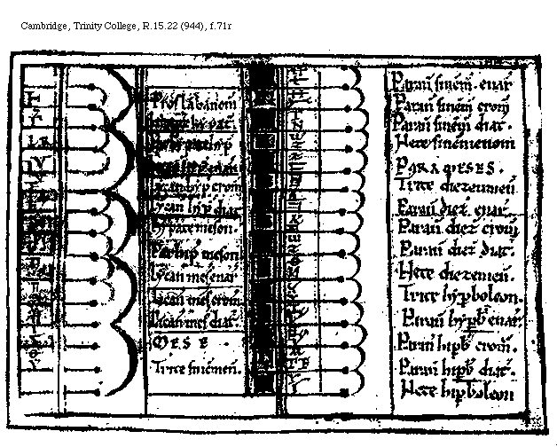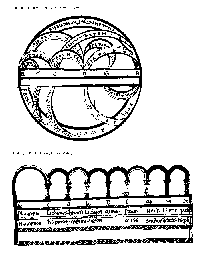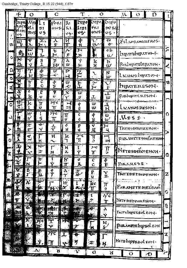 [f.83r][Cambridge, Trinity College, R.15.22 (944), f.83r; text: A, B, C, D, E, F, G, H, I, K, L, M, N, O, P, Q, R, S, T, V, X, Y, Z, BB, CC, DD, EE, FF, GG, HH, KK, LL, Tonus, Semitonium, Diesis, Tetracordum hypaton, Tetracordum meson, Tetracordum sinemmenon, Tetracordum hyperboleon, Diatessaron, Tetracordum diezeumenon, Diapason, Bisdiapason, ENARMONICVM, Proslambanomenos, VIIII[macron supra lin.]CCXVI. Hypatehypaton, VIII[macron supra lin.].CXCII. Parhypatehypaton, VII[macron supra lin.].DCCCCLXXXIIII. Lycanoshypaton, VII[macron supra lin.]DCCLXXVI. Hypatemeson, VII[macron supra lin.]CXLIIII. Parhypatemeson, V[macron supra lin.]DCCCCLXXXIIII. Lycanosmeson enarmonios, V[macron supra lin.].DCCXXXII. MESE, IIII[macron supra lin.].VIII. IIII[macron supra lin.].DCVIII. Trite sinemmenon, IIII[macron supra lin.].CCCCXCII. Paramese, IIII[macron supra lin.].CCVI. Paranete sinemmenon, IIII[macron supra lin.].CCCLXXIIII. Trite diezeumenon, IIII[macron supra lin.].DCCCCXCII. Nete sinemmenon, III[macron supra lin.].CCCCLVI. Paranete diezeumenon, III[macron supra lin.].DCCCLXXXVIII. Nete diezeumenon, IIII[macron supra lin.].LXXII. III[macron supra lin.].LXXII. Trite hyperboleon, II[macron supra lin.].DCCCCXCIIII. Paranete hyperboleon enarmonios, II[macron supra lin.].DCCCCXVI. Nete hyperboleon, II[macron supra lin.].CCCIIII. CROMATICVM, IX[macron supra lin.].CCXVI. VI[macron supra lin.].DCCLXXVI. Licanoshypaton cromatice, VI[macron supra lin.]XCVI. VI[macron supra lin.].CXLIIII. V[macron supra lin.].DCCCXXXII. Lichanosmeson, V[macron supra lin.].CCCCLXXII. IIII[macron supra lin.]. Paranete synemmenon cromatice, IIII[macron supra lin.].IIII. III[macron supra lin.].DCCCCLXXXVIII. III[macron supra lin.].DCXLVIII. Paranete hyperboleon cromatice, II[macron supra lin.].DCCXXVI. DIATONICVM, VI[macron supra lin.].DCCCCXII. Licanosmeson diatonos, V[macron supra lin.].CLXXXIIII. IIII[macron supra lin.].XCVI. Paranete hyperboleon, II[macron supra lin.].DXCII.]