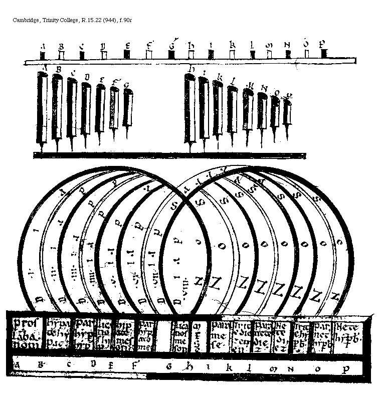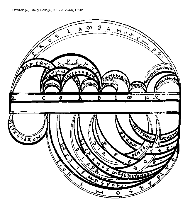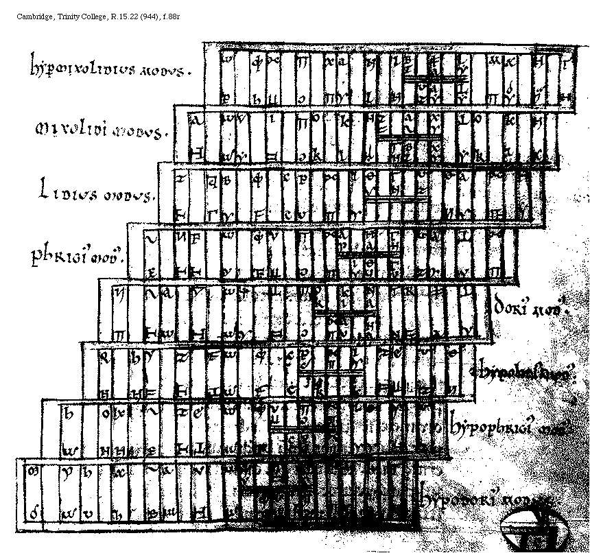 [Cambridge, Trinity College, R.15.22 (944), f.90r; text: A, B, C, D, E, F, G, H, I, K, L, M, N, O, P, Proslambanomenon, Hypate hypaton, Parhypate hypaton, Licanos hipaton, Hipate meson, Parhypate meson, Licanos meson, MESE, paramese, Trite diezemenon, Paranete diezeumenon, Nete diezeumenon, Trite hyperboleon, Parnete hyperboleon, Nete hyperboleon, Diapason, .I. .II. .III. .IIII. .V. .VI. .VII. .VIII.]