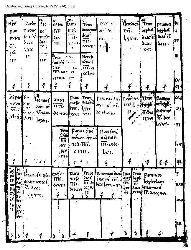 [f.81r][Cambridge, Trinity College, R.15.22 (944), f.81r; text: H. Hypatemeson, VI[macron supra lin.].CXLIIII. L. Parhypatemeson, V[macron supra lin.].DCCCXXXII, M. Licanos meson diatonos, V[macron supra lin.].CLXXXIIII. O, MESE, IIII[macron supra lin.]DCVIII. X. Paramese, IIII[macron supra lin.].XCVI. V. Trite diezeumenon diatonos, IIII[macron supra lin.].CCCVIII. CC. Paranete diezeumenon diatonos, III[macron supra lin.].CCCCLVI. DD. Netediezeumenon, III[macron supra lin.].LXXII. FF. Trite hyperboleon diatonos, II[macron supra lin.].DCCCCXVI. Paranete hyperboleon diatonos. II[macron supra lin.].DCII. A. Trite sinemmon diatonos, IIII[macron supra lin.].CCCLXXIIII. Paranete sinemmenon, III[macron supra lin.].DCCCLXXXVIII. Nete sinemmenon, III[macron supra lin.].CCCCLVI. Diatonicum. Tonus, N. Licanos cromatica. V[macron supra lin.].CCCC.LXXII. Trite diezeumenon, III[macron supra lin.].LXXXVIII. Paranete diezeumenon cromatica, III[macron supra lin.].DCXLVIII. IIII[macron supra lin.].LXXII. Trite hyperboleon, Paranete hyperboleon cromatica, II[macron supra lin.].DCCXVI. Trite sinemmenon, Parate sinemmenon cromaticum, IIII[macron supra lin.].CIIII. Cromaticum, V[macron supra lin.].DCCCLXXXVIII. Licanosmeson enarmonios. IIII[macron supra lin.].DCCCCVI. III[macron supra lin.].DCCCCXCII, Paranete diezeumenon enarmonios, III[macron supra lin.].DCCCLXXXVIII. II[macron supra lin.].DCCCCXCIIII. Paranete hyperboleon enarmonios, II[macron supra lin.].DCCCCXVI. Enarmonium, diesis]