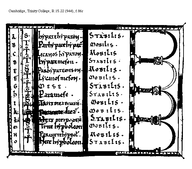 [Cambridge, Trinity College, R.15.22 (944), f.86r; text: A, B, C, D, E, F, G, H, I, K, L, M, N, O, Semitonium, Tonus, Stabilis, Mobilis, Hypatehypaton, Parhypatehypaton, Lichanoshypaton, Hypatemeson, Parhypatemeson, Lycanosmeson, MESE, Paramese, Tritediezeumenon, Paranetediezeumenon, Nete diezeumenon, Trite hyperboleon, Paranete hyperboleon, Netehyperboleon]