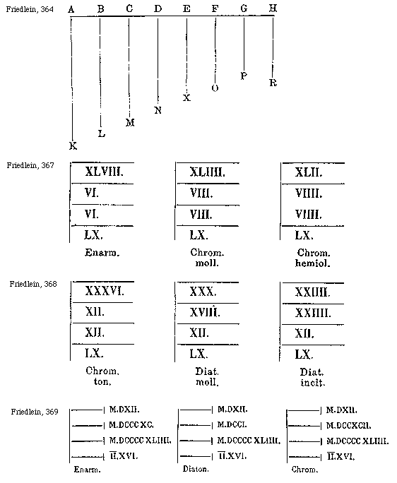 [Friedlein, 369; text: M.DXII. M.DCCCXC. M.DCCCCXLIIII. II[macron supra lin.].XVI. M.DXII. M.DCCI. M.DCCCCXLIIII. II[macron supra lin.].XVI. M.DXII. M.DCCXCII. M.DCCCCXLIIII. II[macron supra lin.].XVI. Enarmonium, Diatonicum, Chromaticum]