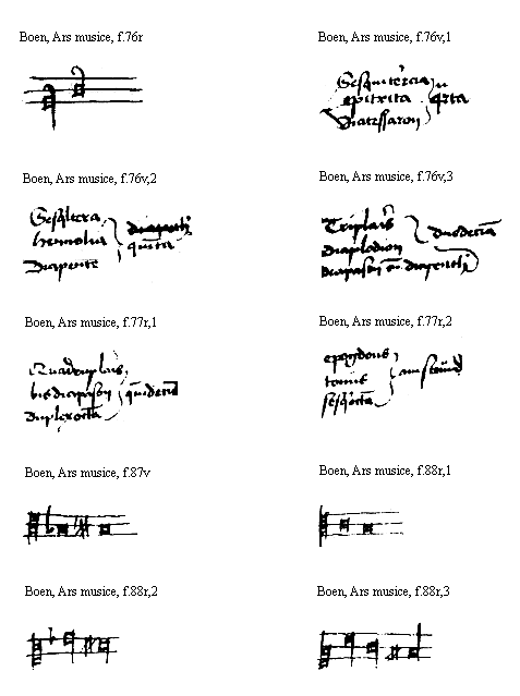 [Boen, Ars musice, f.76v,1; text: Sesquitercia, epitrita, diatessaron, quarta]
