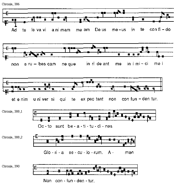 [386][Ciconia, 386; text: Ad te levavi animam meam Deus meus in te confido non erubescam neque inrideant me inimici mei etenim universi qui te expectant non confundentur.]