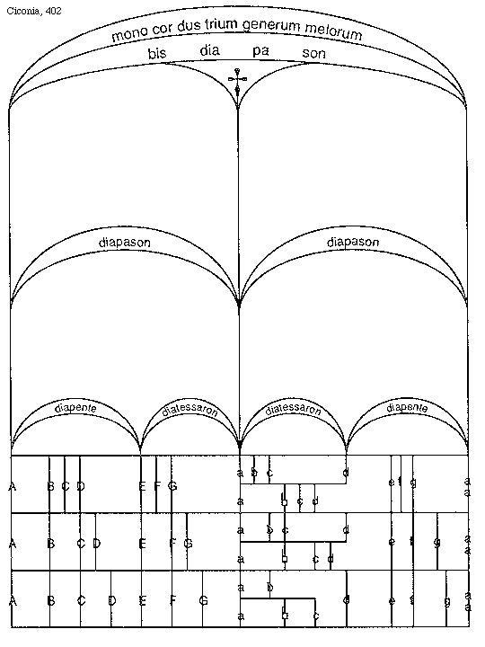 [402][Ciconia, 402; text: monocordus trium generum melorum, bisdiapason, diapason, diapente, diatessaron, A, B, C, D, E, F, G, a, b, [sqb], c, d, e, f, g, aa]