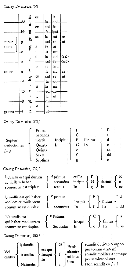 [Czerey, De musica, 498; text: superacute, acute, graves, capitales, minutae, geminatae, A, B, C, D, E, F, G, a, b, c, d, e, f, g, aa, bb, cc, dd, ee, ut, re, mi, fa, sol, la]