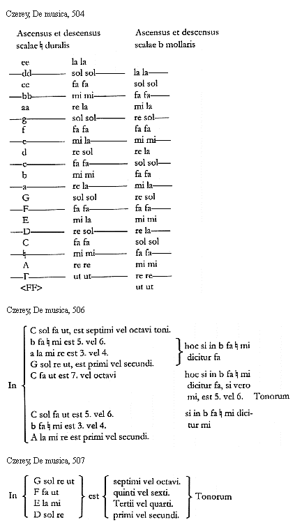 [Czerey, De musica, 502,3; text: Vel cantus, [sqb] duralis, b mollis, Naturalis, est qui Incipit In, G, f, c, Et ab alamire ad b fa [sqb] mi, scandit duriter utpote per tonum re mi, scandit molliter nempe per semitonium, Non scandit eo [...]]