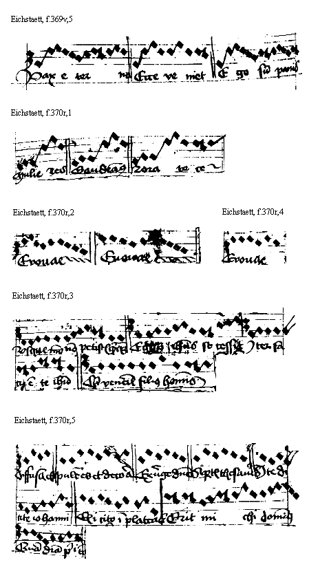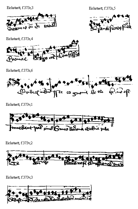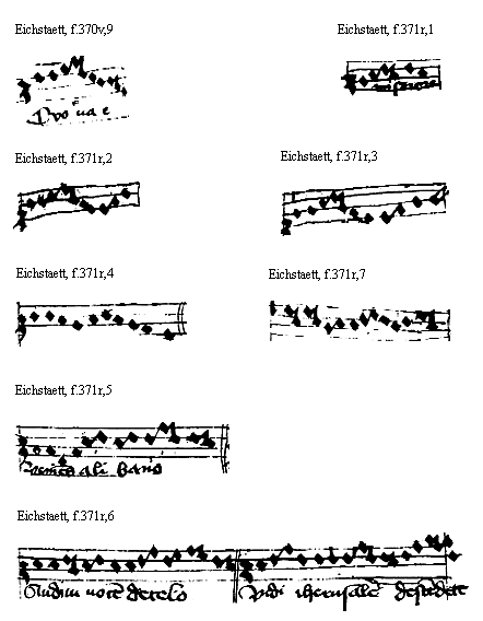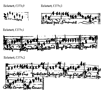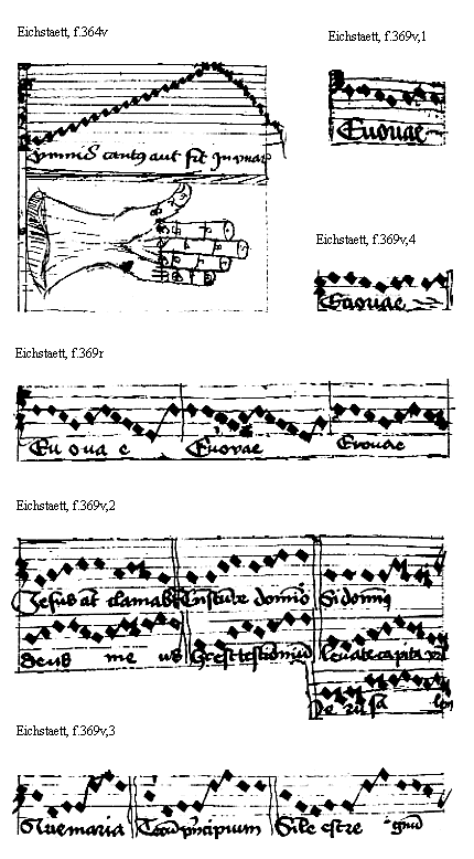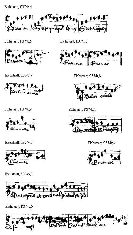 Et in pluribus alijs responsorijs et offertorijs hoc solet euenire Et huius toni tantum vna est differencia Scilicet ista [Eichstaett, f.375v,10; text: Euouae]