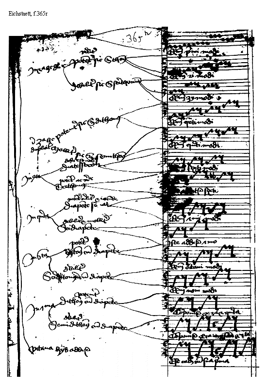 [f.365r][Eichstaett, f.365r; text: Videlicet, in secunda concorditer potentur sic est tonus, debiliter sic est semitonus, In tertia habere potentur sic est dithonus, dupliciter concollitur sic est semithonius In quarta debit sonus diatesseron, potentur ac videlicet Trithonus, In quinta potentur videlicet et iocunde diapenta sonat, debiliter mollitur Semidiapente, In sexta potentur tonus [ditonus ante corr.] cum diapente, debiliter Semitonium [semiditonus ante corr.] cum diapente, In septima potentur dithonus cum diapente, debiliter Semidithonus cum diapente, Octava hijs additur, Exemplum, primi modi, secundi modi, tertij modi, quarti modi, quinti modi, sexti modi, Iste additur septimo, septimi modi, octaui modi, noni modi, Componitur ex tertia et quinta, Componitur ex tertia imperfecta et quarta, Est eadem cum sua prima]
